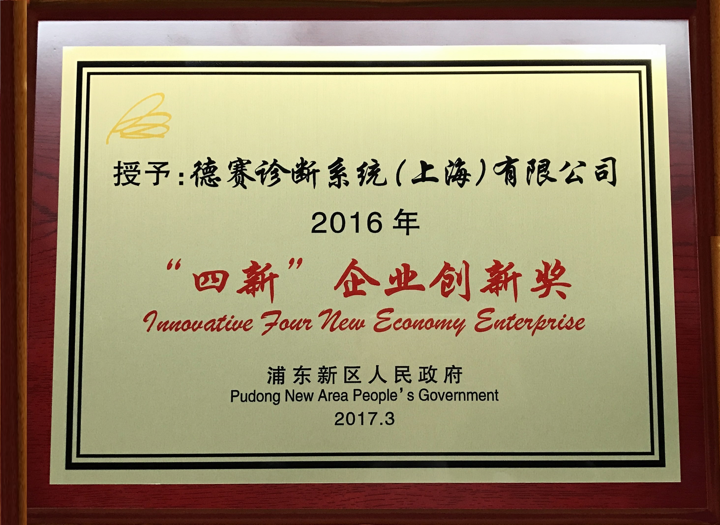 安博在线(中国)子公司德赛诊断荣获上海市浦东新区2016年“四新”企业创新奖