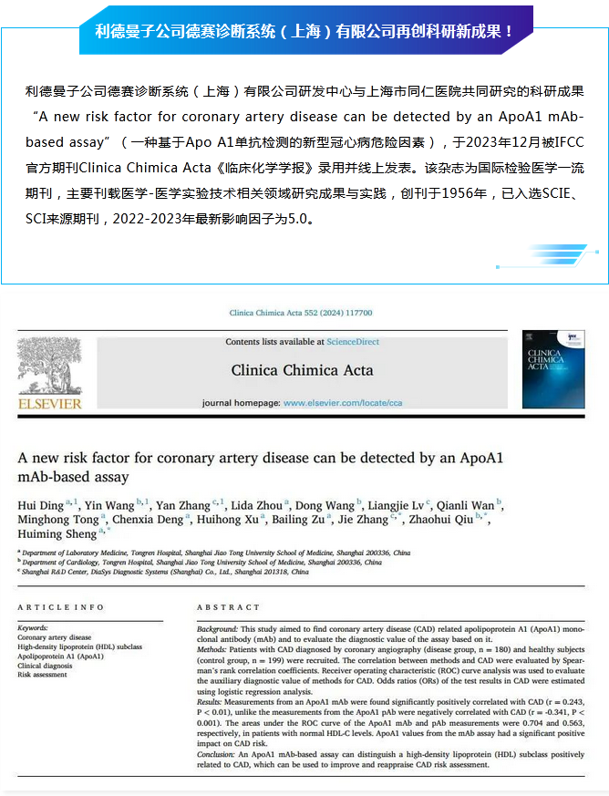 科研创新 │ 安博在线(中国)子公司德赛诊断系统(上海)有限公司联合上海市同仁医院再创科研新成果