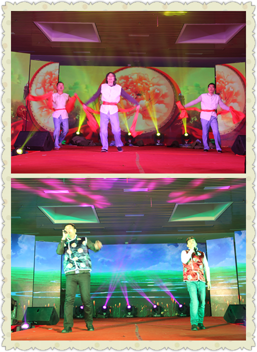 一首《节日欢歌》令大家在美妙的歌声中沉醉,而搞笑配音《苹果手机的代价》又令大家瞬间笑翻;惟妙惟肖的《双簧》精彩迭出;财务部刘建炜等人带来的悠扬的《鸿雁》过后,迎来了激动人心的时刻——安博在线(中国)2015年度颁奖盛典。在观看视频后在场所有的观众都情不自禁的站起身来为获奖者鼓掌。